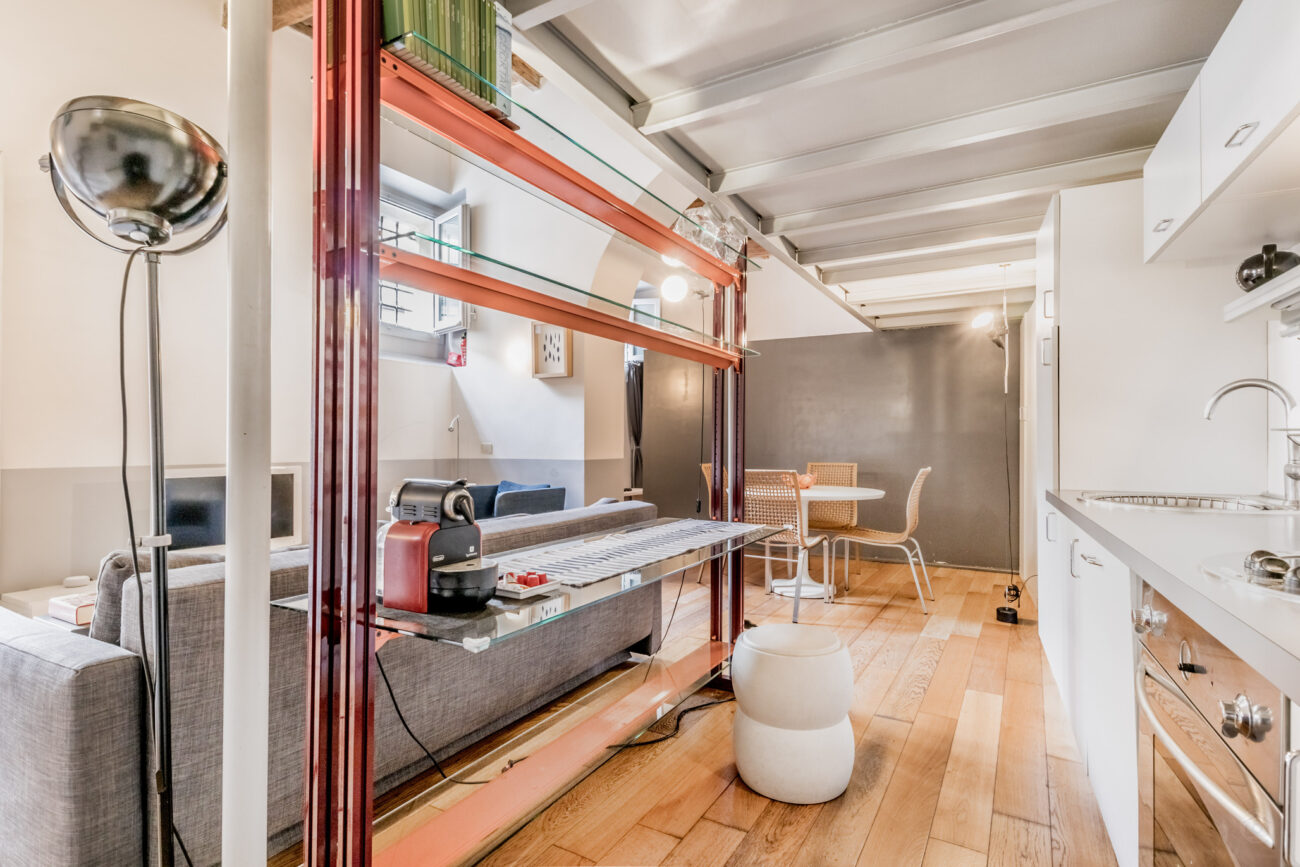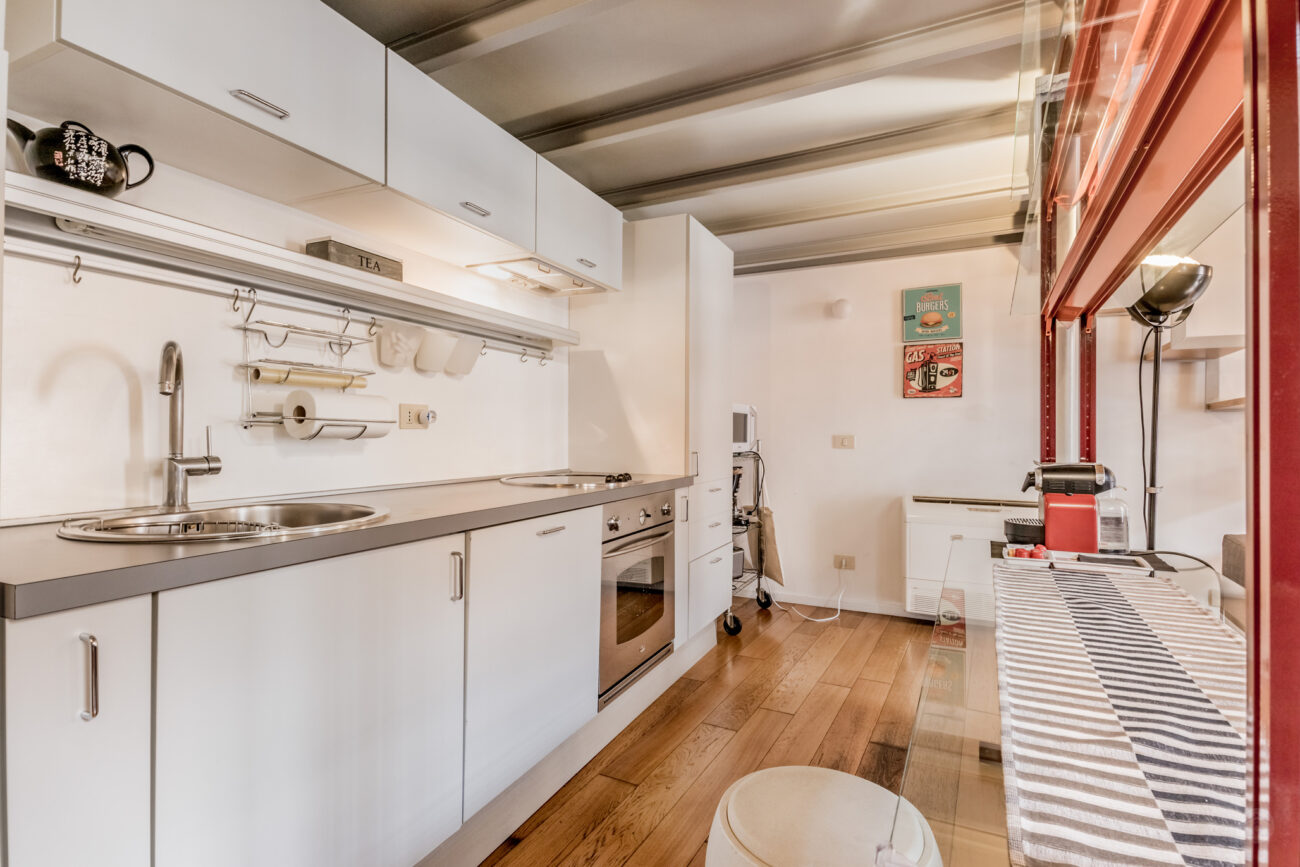 Sei gradini ci conducono ai due portoncini d’accesso all’immobile, entrando troviamo un soggiorno con zona pranzo e cucina a vista ed una struttura metallica di design che serve da bancone.