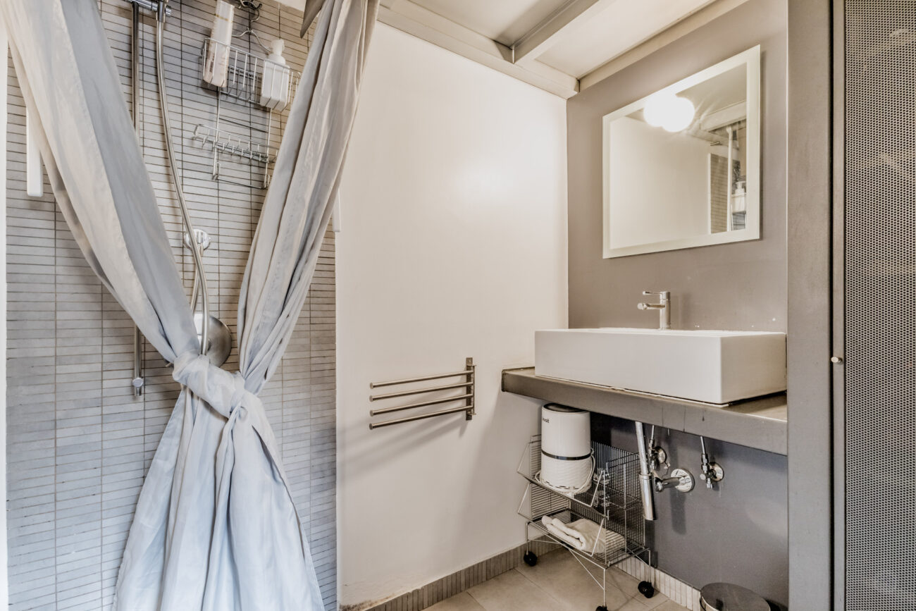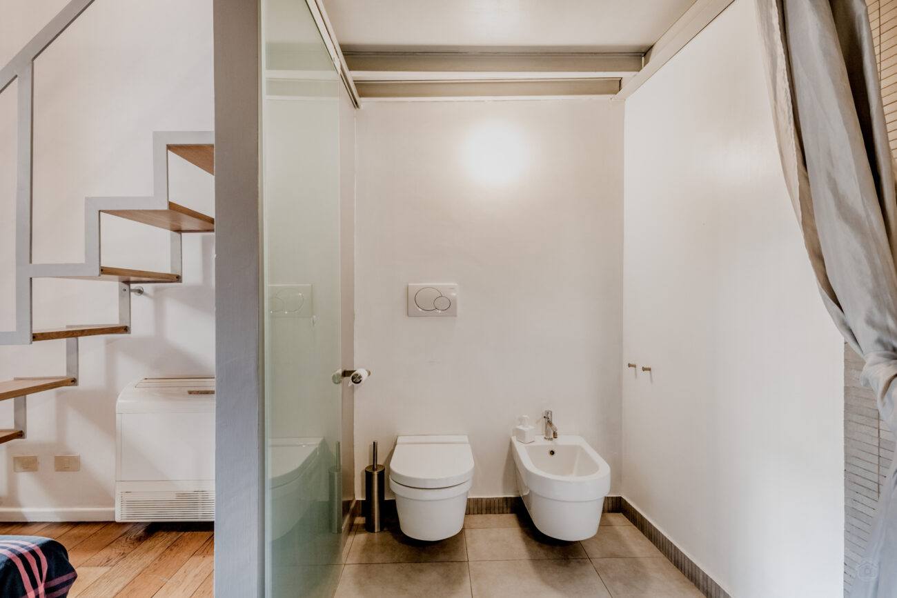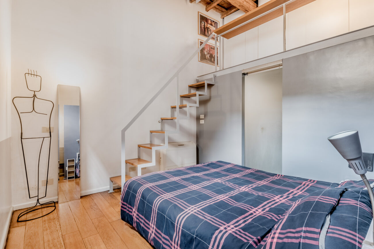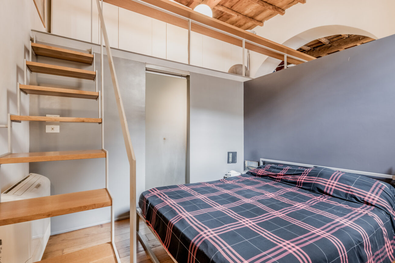 La camera da letto è divisa dagli altri ambienti da una quinta in muratura, all’interno della camera troviamo il bagno con doccia. Il progettista ha realizzato delle opere di falegnameria volte all’ottimizzazione degli spazi, creando cosi una zona lavanderia completa.
